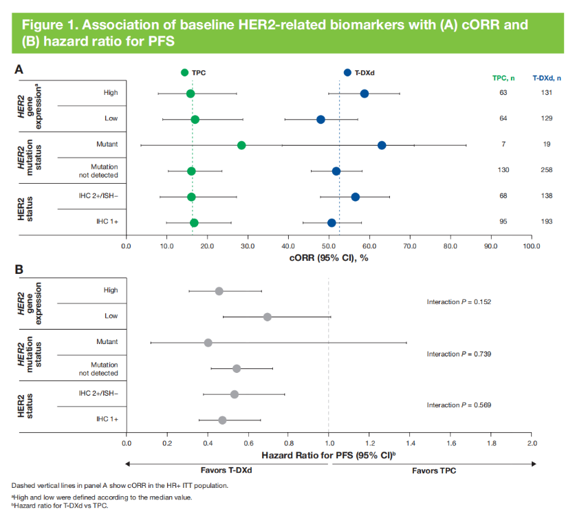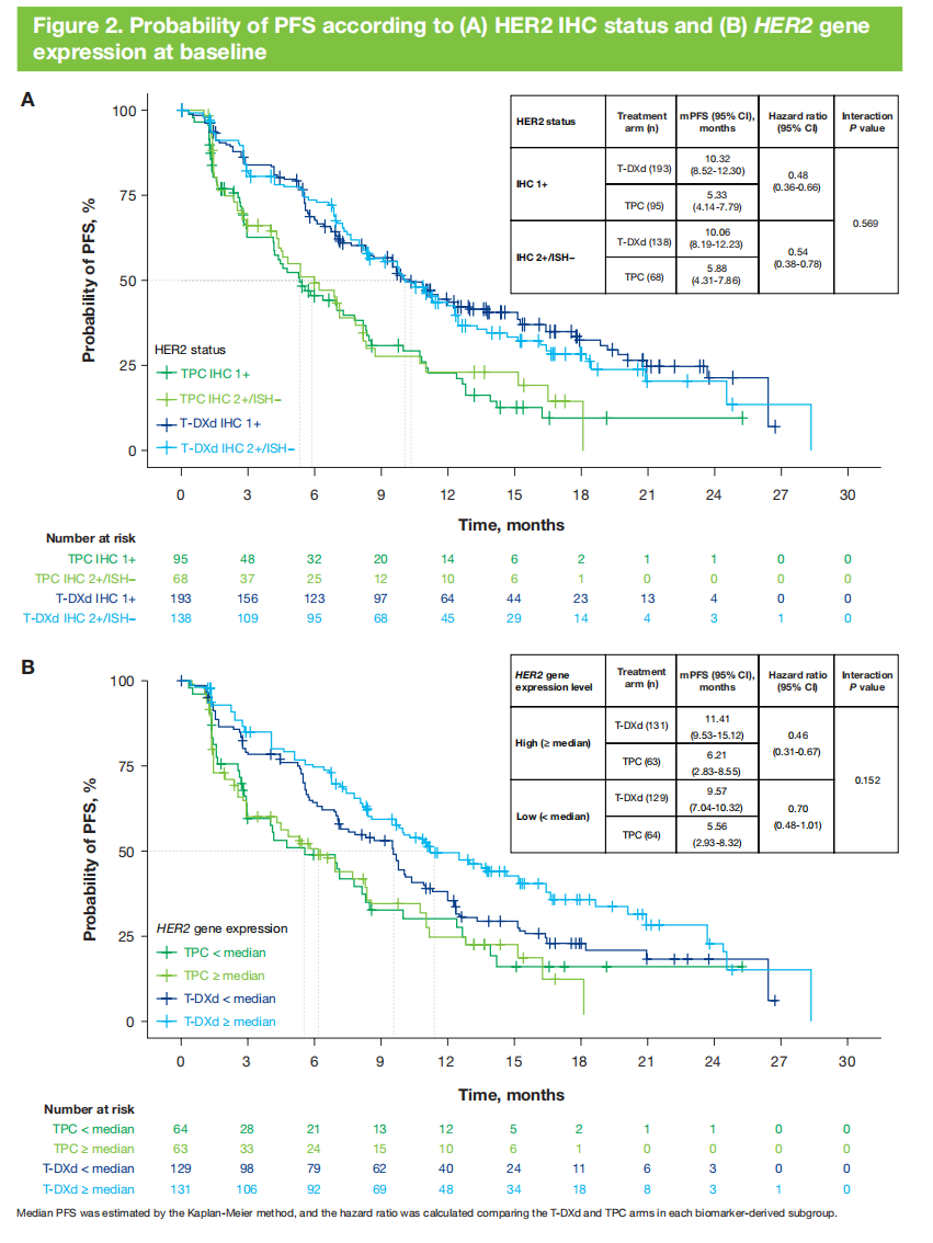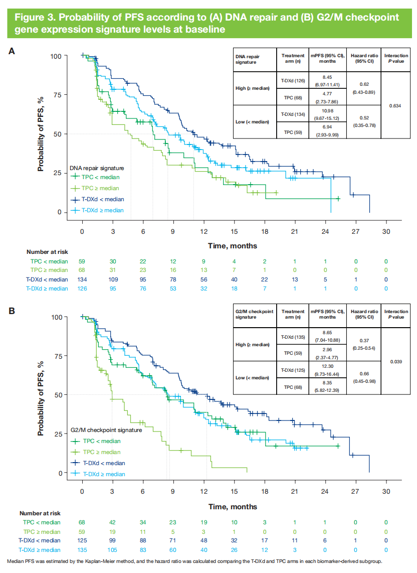 总体而言,在生物标志物定义的人群中,T-DXd组的cORR高于TPC组,mPFS长于TPC组,这与意向性治疗(ITT)人群一致,并且在生物标志物可评估的人群之间,临床结局具有可比性。