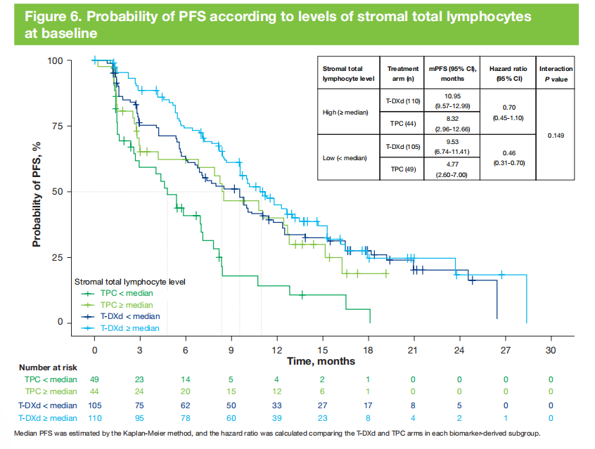 与TPC相比,T-DXd在所有分析的生物标志物亚组中均表现出有临床意义的PFS和ORR改善,包括HER2基因表达水平、BRCA1/2或HRR基因状态改变、DDR/细胞增殖基因特征状态以及免疫状态(sTILs)。本分析有一定局限性,包括某些生物标志物亚组的患者数量较少,以及循环肿瘤DNA组合测序在检测结构变异(BRCA1/2和HRR改变状态)方面的局限性。