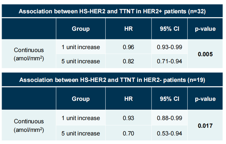 HS-HER2的定量评估(以attomols/mm2为单位)被证明可以预测T-DXd在MBC中的临床疗效,包括在HER2阳性和HER2阴性MBC的亚组分析。