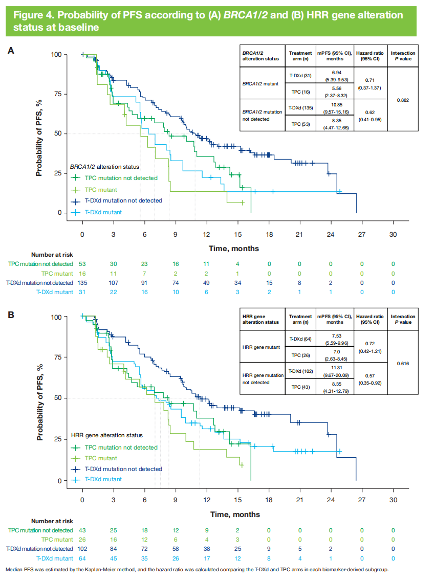 无论BRCA1/2或HRR基因是否发生改变,T-DXd组相较于TPC组的临床获益均保持不变,且基于这些生物标志物的分析未显示出统计学上的显著交互作用(图3A、图4)。