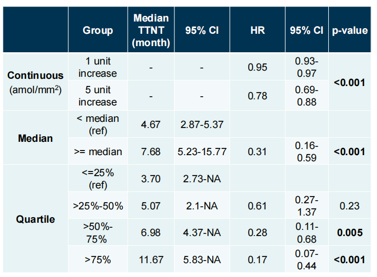 此外,TTNT和HS-HER2四分位数之间存在显著相关性,随着HS-HER2四分位数的增加,中位TTNT有增加的趋势(P=0.002,表3)。