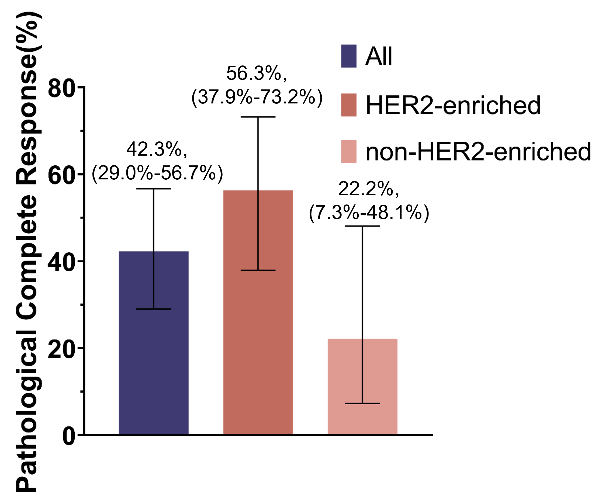在已经完成手术的52名患者中评估疗效终点:主要终点HER2富集型的tpCR率为56.3%(18/32,95%CI:37.9%~73.2%)。而非HER2富集型患者的tpCR率仅为22.2%(4/18,95%CI:7.3%~48.1%)。