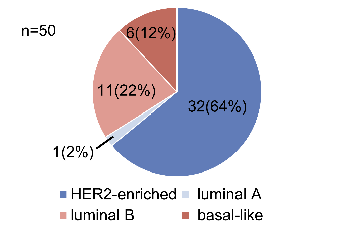 分子分型的结果显示HER2富集亚型患者占比最多,达到64%(n=32),其余三种亚型占比分别为:Luminal B型22%(n=11),Basal-Like型12%(n=6)以及Luminal A型2%(n=1)。