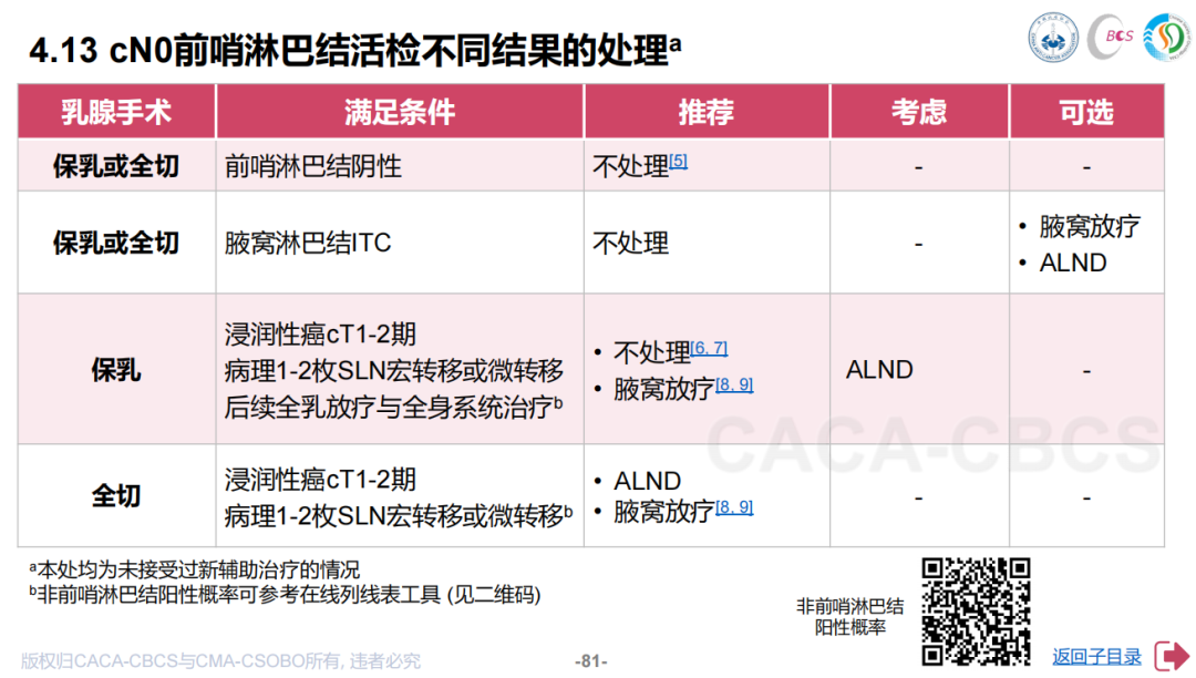 ·在区域淋巴结活检及处理方面,为cN0患者提供了预测非前哨淋巴结阳性概率的列线图(附二维码)。