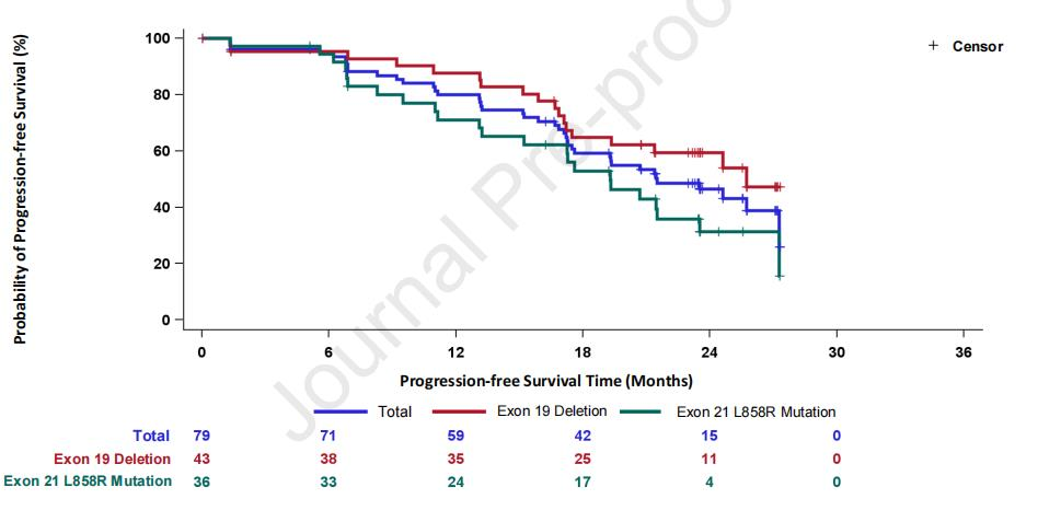 研究结果:研究共计纳入105例患者(剂量爬坡19例患者,剂量拓展86例患者)。在剂量爬坡阶段,未观察到剂量限制性毒性,未达到最大耐受剂量。95.2%的患者观察到任何级别治疗相关不良反应,其中3度及以上治疗相关不良反应的发生率为30.5%。最常见的治疗相关不良反应包括血细胞计数降低(54.3%)、中性粒细胞降低(46.7%)、血肌酸激酶升高(39.0%)和贫血(39.0%)。在剂量拓展阶段,一线接受该药治疗且携带19del或21L858R突变的患者,中位PFS为21.5个月,ORR为85.9%。亚组分析显示,36例携带21L858R突变的患者,中位PFS为19.3个月,ORR为86.1%。