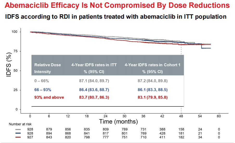 降低剂量的患者累积剂量和RDI较低,但继续接受阿贝西利治疗的可能性较高。在3个RDI组(≤66%vs 66%-93%vs≥93%)中,4年IDFS率总体一致(从最低RDI组到最高组分别为87.1%vs 86.4%vs 83.7%)。