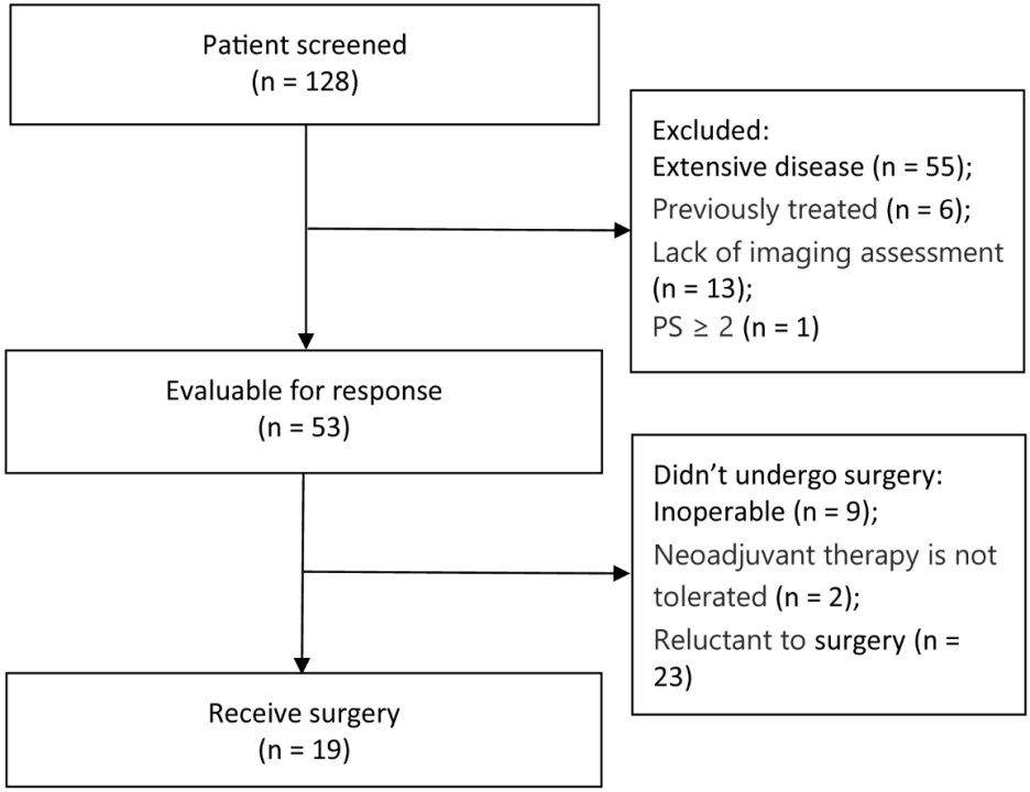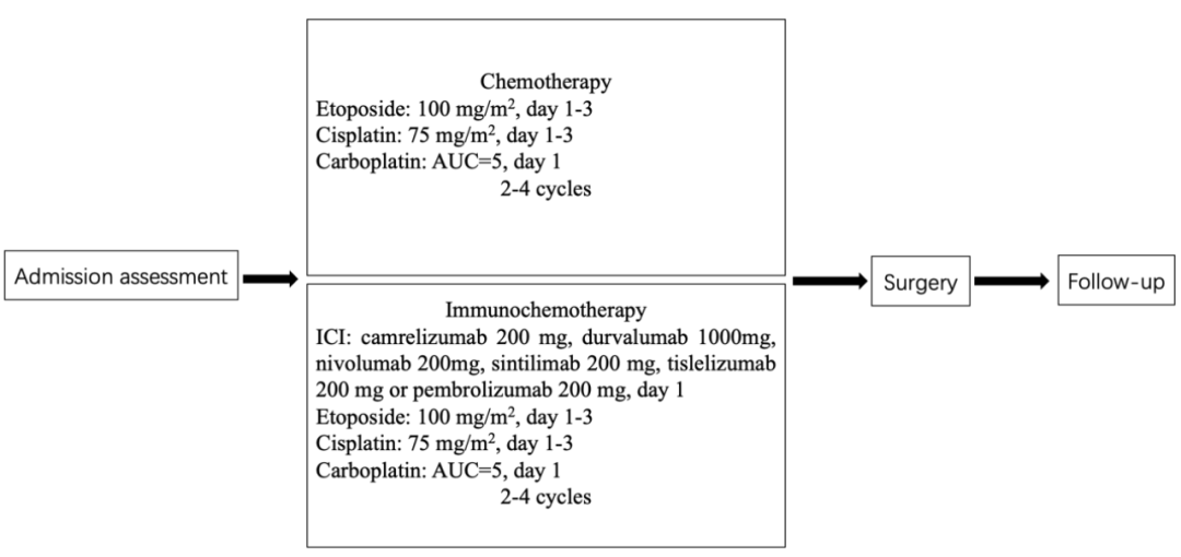 本研究连续收集了2019年1月至2021年7月在浙江大学医学院附属第一医院普胸外科接受2-4个周期(每个周期3周)新辅助免疫治疗联合化疗或常规化疗的LS-SCLC(I-IIIB期)患者。免疫药物主要是卡瑞利珠单抗(Camrelizumab)。随访持续到手术后至少1年,或患者决定放弃治疗,或研究终止。主要观察终点包括病理反应[主要病理学反应(MPR)和病理学完全缓解(pCR)],而次要观察终点包括客观缓解率(ORR)、治疗相关不良反应(trAEs)、手术切除率和无病生存率(DFS)。