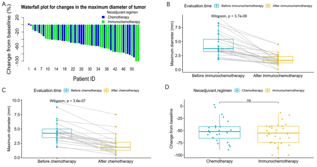 免疫治疗联合化疗组的客观缓解率为89.5%(26/29),常规化疗组为75.0%(18/24)(P=0.206)。