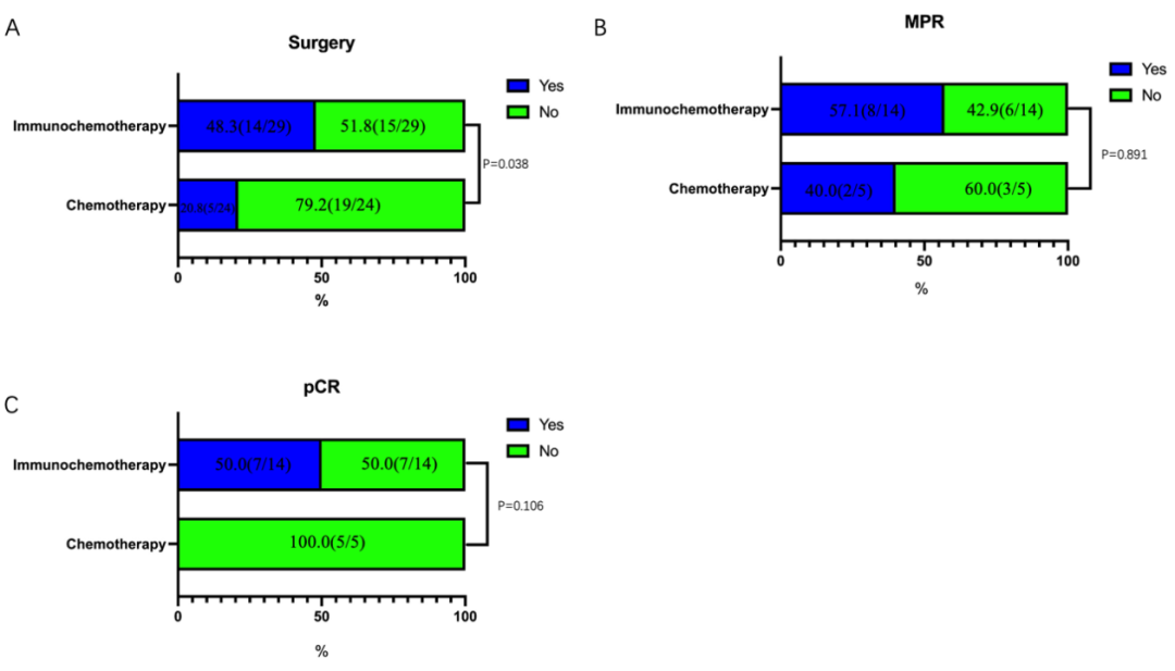 在这53名患者中,共有19名患者接受了手术,其中免疫治疗联合化疗组14名患者,常规化疗组5名患者。免疫治疗联合化疗组的手术切除率为48.3%(14/29),显著高于常规化疗组(20.8%,5/24,P=0.038)。免疫治疗联合化疗组的MPR率为57.1%(8/14),常规化疗组为40.0%(2/5)(P=0.891)。免疫治疗联合化疗组和常规化疗组的pCR率分别为50.0%(7/14)和0.0%(0/5)(P=0.106)。