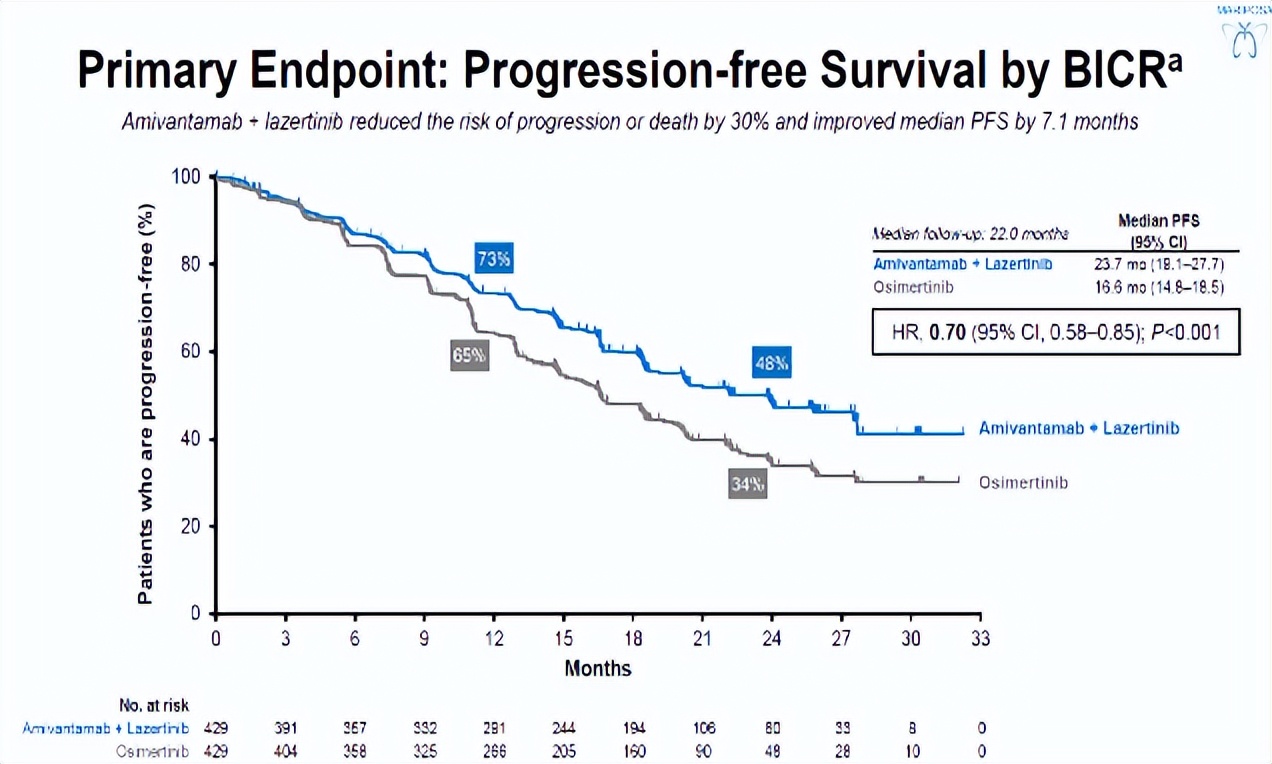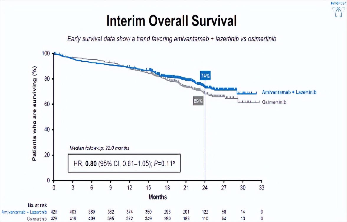 在2023年欧洲内科肿瘤学会(ESMO)年会上,MARIPOSA研究首次公布了主要终点中位无进展生存期(PFS)数据,结果显示:与奥希替尼相比,埃万妥单抗联合兰泽替尼显著延长中位PFS,两组分别为23.7个月和16.6个月(HR=0.70;95%CI,0.58-0.85;P<0.001)。中位随访22.0个月时,OS数据尚未成熟,HR=0.80,呈现获益趋势。