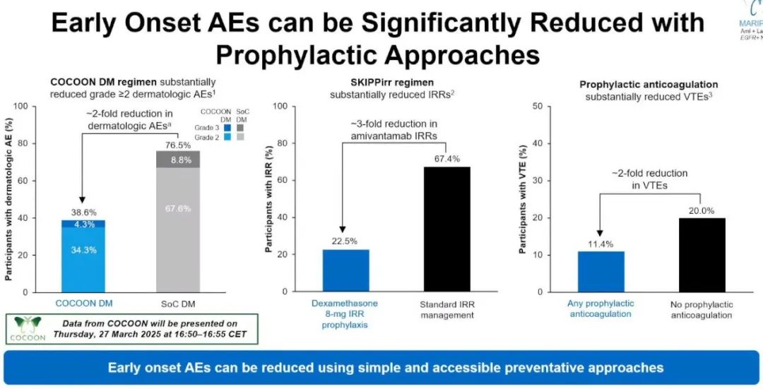 当然,联合治疗必然会带来更多的不良反应发生。在MARIPOSA研究中,我们观察到了与EGFR和MET抑制相关的AE,也看到了IRR、VTE的发生。但值得注意的是,在研究过程中,仅有5%患者基线进行了预防性抗凝治疗,21%患者基线进行了预防性皮肤处理。强生公司也关注到了AE的问题,开展了多项改善AE的研究。