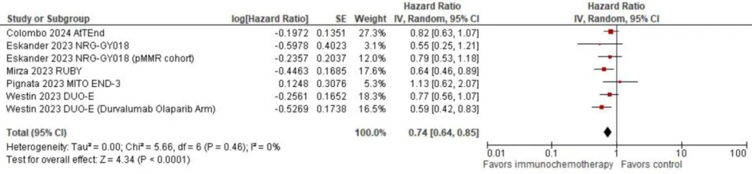 在原发性晚期或复发性子宫内膜癌患者中,免疫联合化疗方案相比标准化疗可显著改善总体人群的PFS与OS。亚组分析显示,无论患者MMR状态(dMMR或pMMR),免疫联合化疗均可带来PFS获益。本研究支持将免疫治疗纳入原发性晚期或复发性子宫内膜癌的标准治疗体系。
