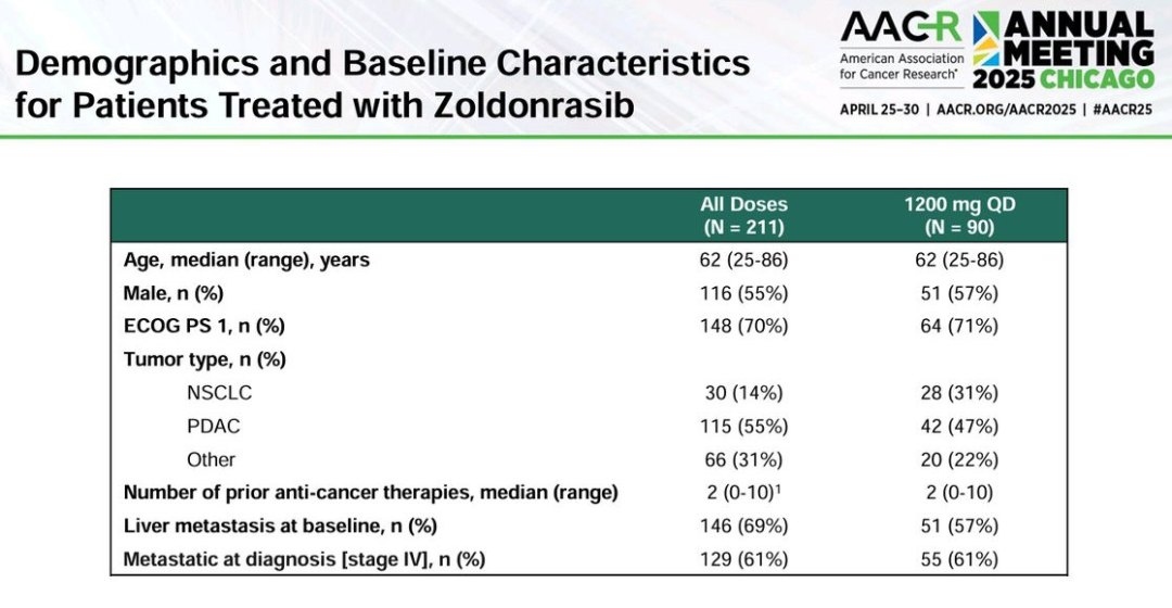 在非小细胞肺癌中,与其他非G12D亚型相比,KRAS G12D突变通常与患者不吸烟、PD-L1表达较低以及肿瘤突变负荷(TMB)较低相关,也与免疫检查点抑制的疗效不佳有关。I期RMC-9805-001临床试验纳入了携带KRAS G12D突变的经治晚期实体瘤患者,ECOG体能状态评分为0或1分,且无任何活动性脑转移。至数据截止日期,共有211名不同肿瘤类型的患者接受了不同剂量的Zoldonrasib治疗,其中14%的患者患有非小细胞肺癌。既往接受的抗癌治疗数量为2种(范围:0-10种)。69%的患者基线时存在肝转移,61%的患者在诊断时已存在转移性疾病。