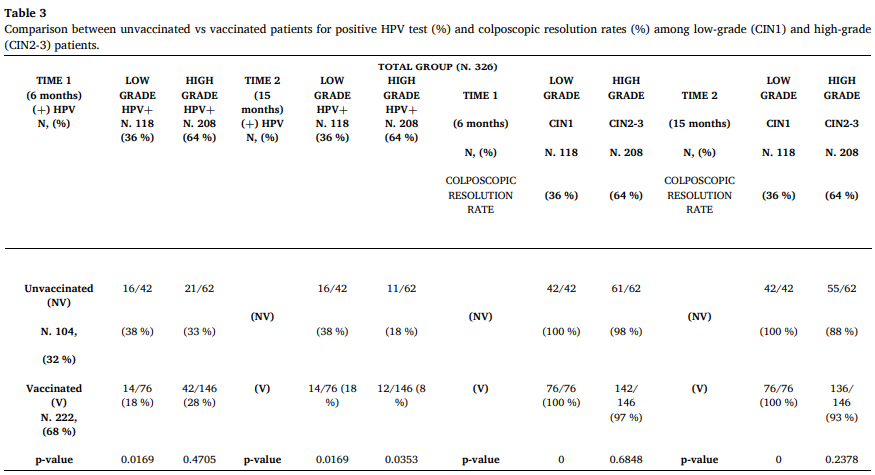 在15个月的随访期间,接种疫苗组CIN2-3患者的HPV阳性率显著低于未接种疫苗组(8%vs 18%;P=0.0353)。