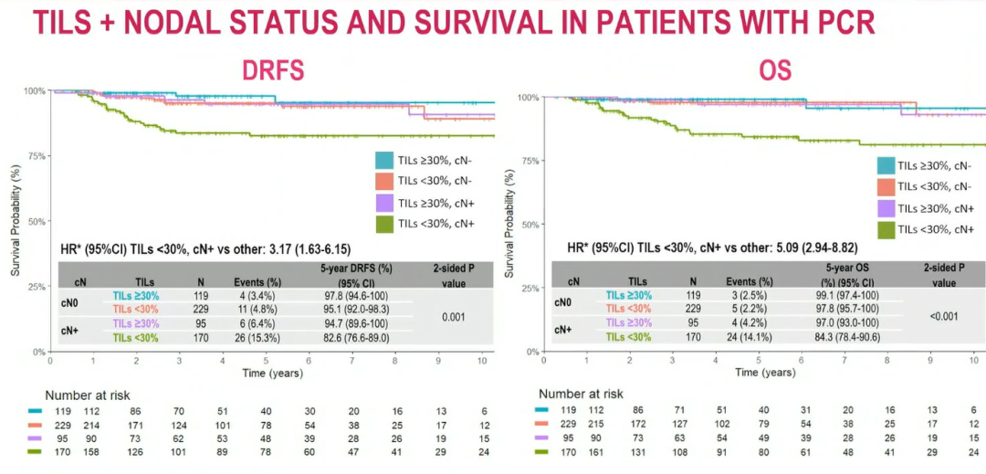研究结论:在接受NAT治疗的TNBC患者中,结合基线TILs和淋巴结状态可以识别出一个尽管达到pCR但仍具有相对较高复发风险的亚组(治疗前cN+和TILs<30%这一人群:5年DRFS为83%,5年OS为84%)。这些数据可能为那些原本被认为具有良好长期预后的患者制定新辅助治疗后的策略提供依据。