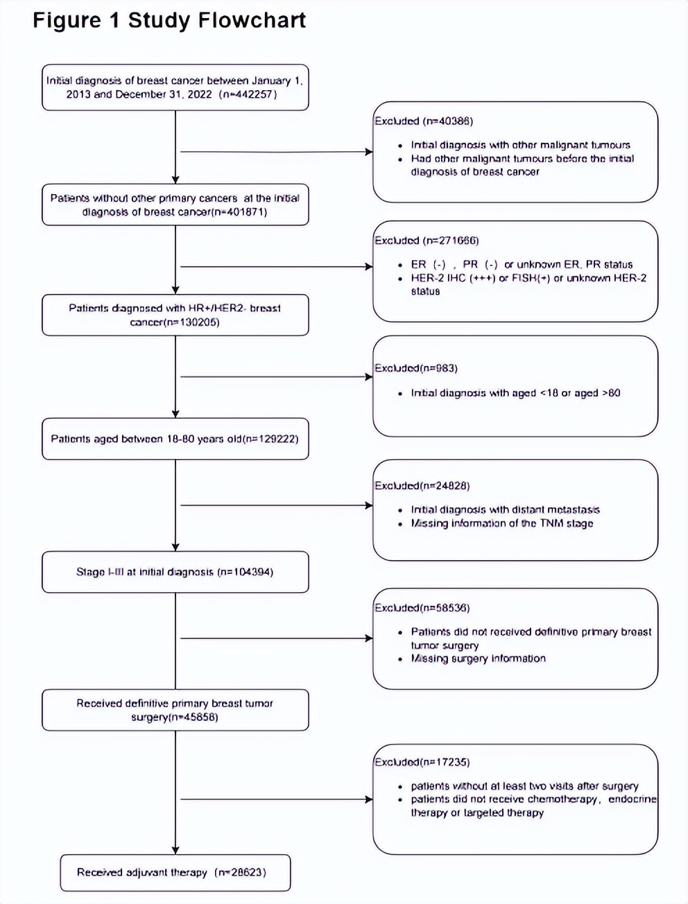 本研究回顾性分析了2013年1月~2022年12月期间从中国国家癌症数据库中诊断出的HR+/HER2-早期乳腺癌(I-III期)患者的电子病历(图1)。按年龄(≤40岁和>40岁)对患者进行分层。