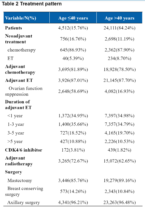 在luminal型乳腺癌患者治疗过程中,年龄是一定要考虑的临床因素。而且年龄和月经状态密切相关,内分泌治疗患者的激素受体状态决定了部分患者人群是否会考虑采用OFS(卵巢功能抑制)以及采用更强的内分泌治疗和辅助治疗策略等。基于此背景,我们团队借助国家癌症中心的数据库平台展开分析,目的是评估真实世界中中国年轻HR+/HER2-患者的临床病理特征和治疗模式对其预后的影响。