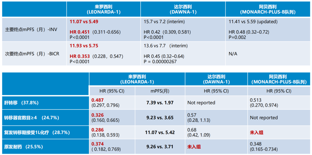 除了入组患者更加宽泛,LEONARDA-1研究显示来罗西利对肝转移、转移器官数目≥4、复发转移期接受1L化疗、原发耐药等难治性患者,也有非常好的PFS获益,而这些数据在其他完全针对中国患者的同类CDK4/6i相关临床研究中并未完全获知[5-7]。