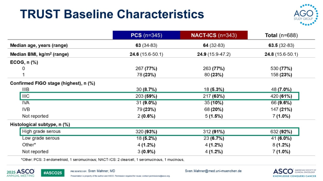 TRUST研究的参与中心需保证能通过现场手术质量审核,并且需具备良好的基础设施条件。研究者的手术质控标准包括每年至少完成36例晚期卵巢癌的PCS,且R0切除率需达50%或以上。797例FIGO IIIB-IVB期且体能状态良好(ECOG评分0/1)的卵巢癌、输卵管癌或腹膜癌患者随机分配至以下两组,1)PCS组:患者接受PCS后行6个周期化疗;2)NACT-ICS组:3个周期NACT后接ICS,术后再完成3个周期化疗。两组均允许使用贝伐珠单抗和/或PARP抑制剂的维持治疗。688例可评估患者,中位年龄63岁(32-83岁),其中345例接受了PCS,343例接受了NACT-ICS。92%的患者为高级别浆液性癌。根据研究中心、年龄和ECOG体能状态评分对患者进行分层。