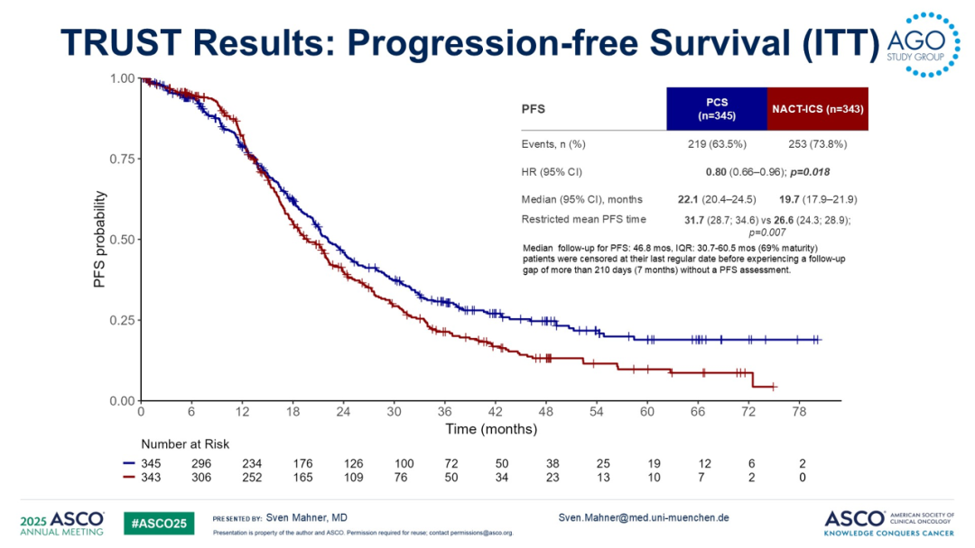 TRUST随机试验比较了预估可切除的晚期卵巢癌患者接受初始肿瘤细胞减灭术(PCS)或新辅助化疗后间歇性肿瘤细胞减灭术(NACT-ICS)在疗效和安全性方面的差异,旨在评估初治晚期卵巢癌的最优手术治疗策略。德国慕尼黑慕尼黑大学的Sven Mahner在2025 ASCO上报告了该研究的结果(LBA5500)[1]。《肿瘤瞭望》邀请浙江省肿瘤医院朱笕青教授对这项研究结果予以点评。