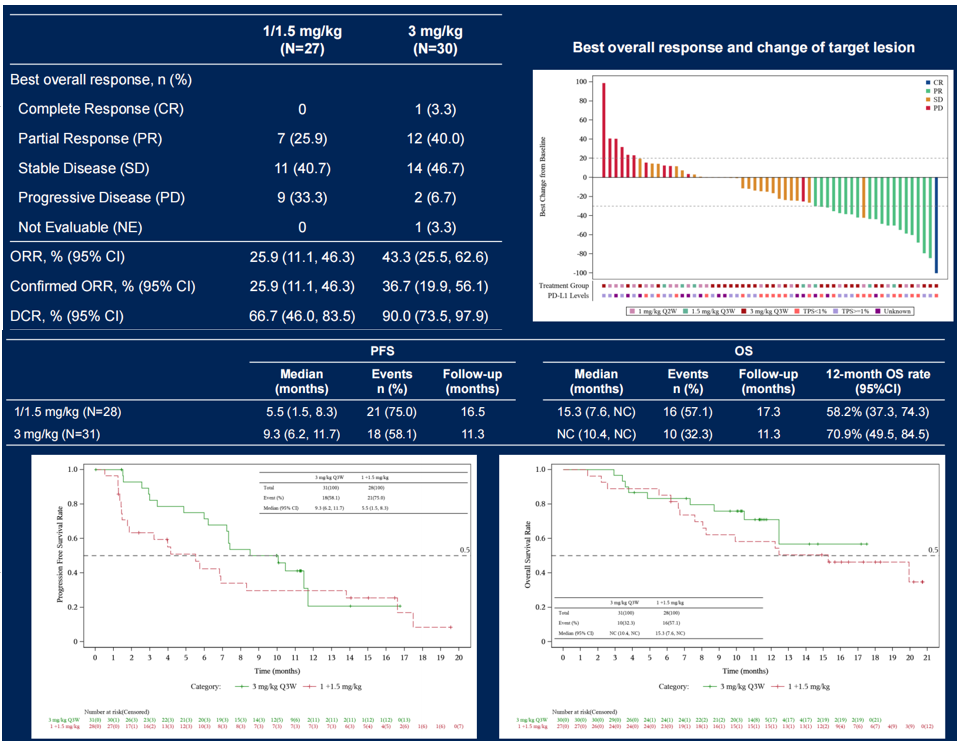 在至少完成一次基线后肿瘤评估的鳞癌患者中,3 mg/kg剂量组显示出更优的疗效趋势。数据显示,该剂量组确认的ORR为36.7%,中位PFS为9.3个月,DCR为90.0%,中位OS未达到(中位随访11.3个月)(图1)。