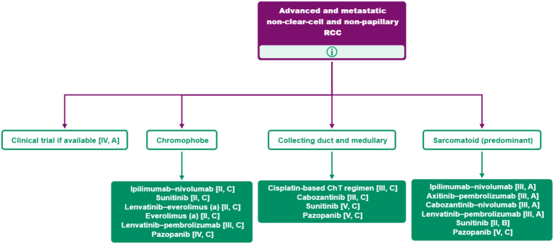 4、对于肾集合管癌和SMARCB1缺陷型肾细胞癌,建议采用以顺铂为基础的化疗[III,C]。舒尼替尼[V,C]、培唑帕尼[V,C]和卡博替尼[III,C]是替代方案。