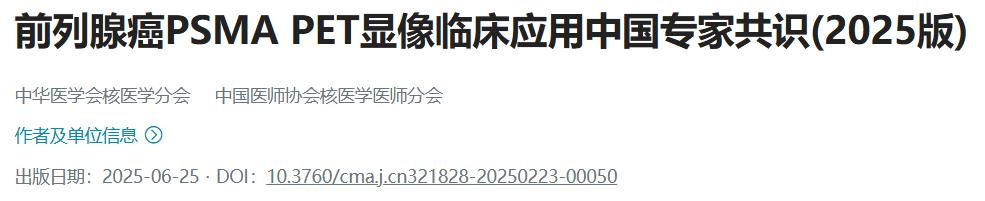 中华医学会核医学分会,中国医师协会核医学医师分会. 前列腺癌PSMA PET显像临床应用中国专家共识(2025版). 中华核医学与分子影像杂志,2025,45(06):364-371. DOI:10.3760/cma.j.cn321828-20250223-00050