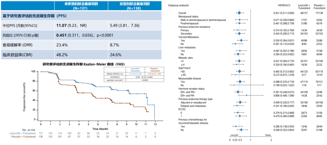 从疗效结果来看,这两项研究都取得了阳性结果。在初治患者的LEONARDA-2研究中,研究者评估来罗西利+来曲唑组和安慰剂+来曲唑组的PFS分别为NR和16.56个月,疾病进展或死亡风险显著降低53.6%(HR 0.464;95%CI:0.293~0.733;P=0.0004);其中,内脏转移(HR 0.420)、高肿瘤负荷(转移部位数≥3)(HR 0.399)等难治性患者也有非常不错的PFS获益。在ET经治的LEONARDA-1研究中,研究者评估来罗西利+氟维司群组的中位PFS达到了安慰剂+氟维司群组的2倍(11.07 vs 5.49个月),疾病进展或死亡风险显著降低54.9%(HR 0.451,95%CI:0.311~0.656,P<0.0001);而且肝转移(HR 0.487)、原发耐药(HR 0.374)、高肿瘤负荷(转移器官数目≥4)(HR 0.326)、复发转移期接受过一线化疗(HR 0.286)等难治性患者同样显示有非常好的PFS获益。