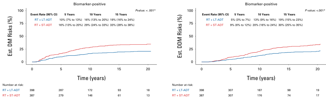 在验证队列中,患者的中位监测时间为17.2年;长期ADT治疗显著降低了远处转移的发生率,从26%降至17%(HR 0.64;P<0.001)。