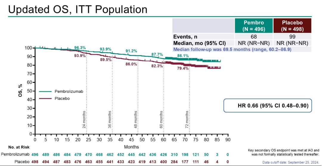 共994例患者被随机分配接受帕博利珠单抗(n=496)或安慰剂(n=98)治疗。截至2024年9月25日的数据截止日期,中位随访时间为69.5个月。所有患者在3年前完成了或停止了研究治疗。帕博利珠单抗组和安慰剂组分别发生了188例和241例DFS事件。中位DFS未达到(NR),而安慰剂组为68.3个月(HR 0.71,95%CI:0.59-0.86);5年时的估计DFS率分别为60.9%和52.2%。帕博利珠单抗组和安慰剂组分别发生了68例和99例OS事件。两组的中位OS均为NR(HR 0.66,95%CI:0.48-0.90);5年时的估计OS率分别为87.7%和82.3%。DFS和OS结果在包括预先规定的风险和肉瘤样特征在内的关键亚组中是一致的。在3年内没有报告新的严重治疗相关不良反应。