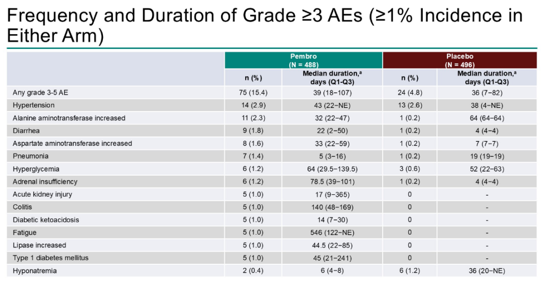 Naomi Balzer Haas教授:在KEYNOTE-564研究中,OS保持相对稳定。风险比与我们之前观察到的情况相似,Kaplan-Meier曲线在辅助治疗结束后不久即开始分离,并持续保持分离状态。在长期随访中,我们没有观察到新的安全性信号。在我们的报告中,我们展示了严重不良事件的频率和持续时间。最常见的严重不良事件是高血压、肝酶升高(转氨酶升高)和腹泻。我们还展示了这些事件的持续时间,即严重不良事件完全缓解所需的时间。这些数据也在报告中进行了展示。