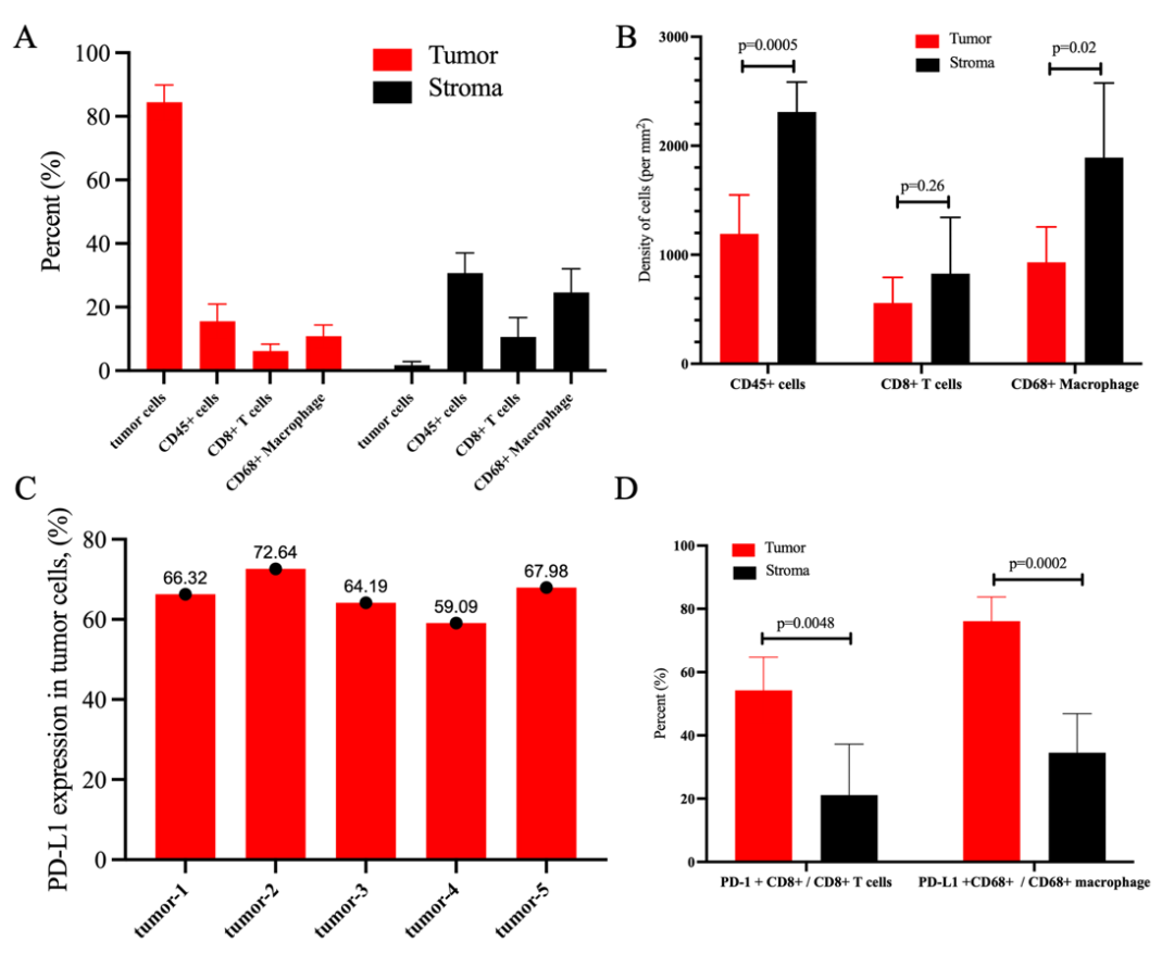 A,肿瘤与基质区域的细胞组成;B,CD45+免疫细胞、CD8+T细胞及CD68+巨噬细胞在肿瘤与基质区域的密度;C,肿瘤细胞PD-L1表达水平;D,肿瘤与基质区域中PD-1+CD8+T细胞及PD-L1+CD68+巨噬细胞的比例。