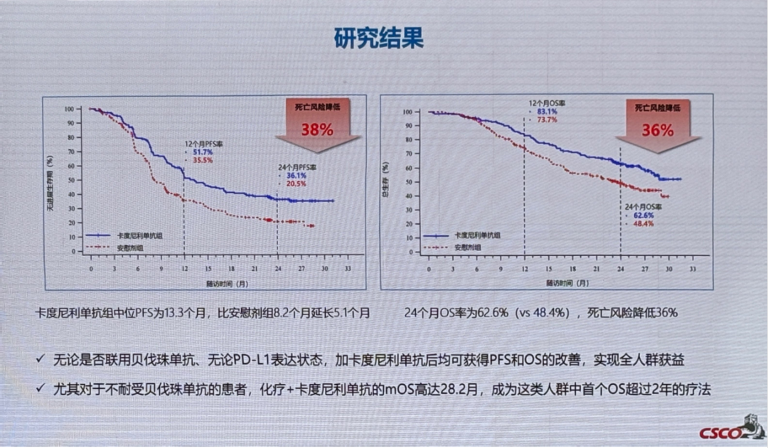 研究结果显示,卡度尼利单抗组和安慰剂组的中位PFS分别为12.7个月和8.1个月(HR 0.62,P<0.0001),12个月PFS率分别为51.1%和35.0%。卡度尼利单抗组中位OS未达到,安慰剂组为22.8个月(HR 0.64,P=0.0011),12个月OS率分别为83.1%和73.7%,24个月OS率分别为62.6%和48.4%。最常见≥3级AE为中性粒细胞减少、白细胞减少和贫血。
