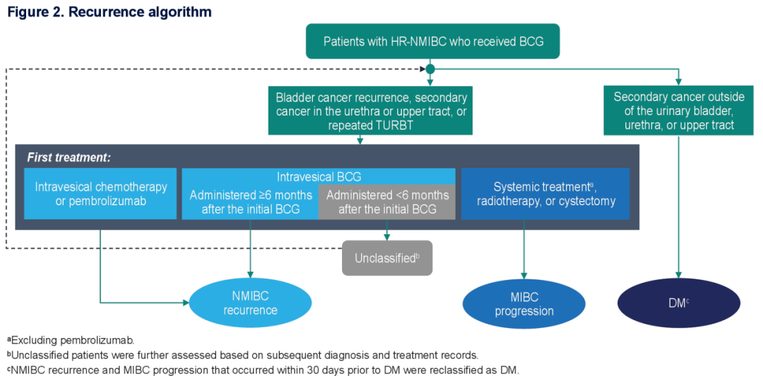 本研究对接受BCG治疗的高危非肌层浸润性膀胱癌(HR-NMIBC)患者进行了一项回顾性队列研究,以BCG起始日期为指标日期。开发了一种复发算法,用于识别和分类复发事件,包括NMIBC复发、肌层浸润性膀胱癌(MIBC)进展和远处转移。