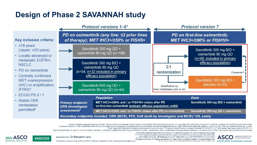 研究纳入年龄≥18周岁的晚期非小细胞肺癌患者,接受奥希替尼后出现耐药。在第1-6版研究方案中,研究者主要对剂量、人群等进行相应探索。初始MET基因异常定义为IHC3+≥50%或拷贝数≥5,随后将这一定义进一步拓展为IHC3+≥90%或拷贝数≥10,治疗剂量也由初始的300 mg,口服,每日一次调整为300 mg,口服,每日两次。最终,经过探索后进行一项小型II期随对照临床研究,以探索赛沃替尼300 mg,口服,每日两次联合标准剂量的奥希替尼治疗这部分患者的疗效以及安全性,对照组选择赛沃替尼300 mg,口服,每日两次。