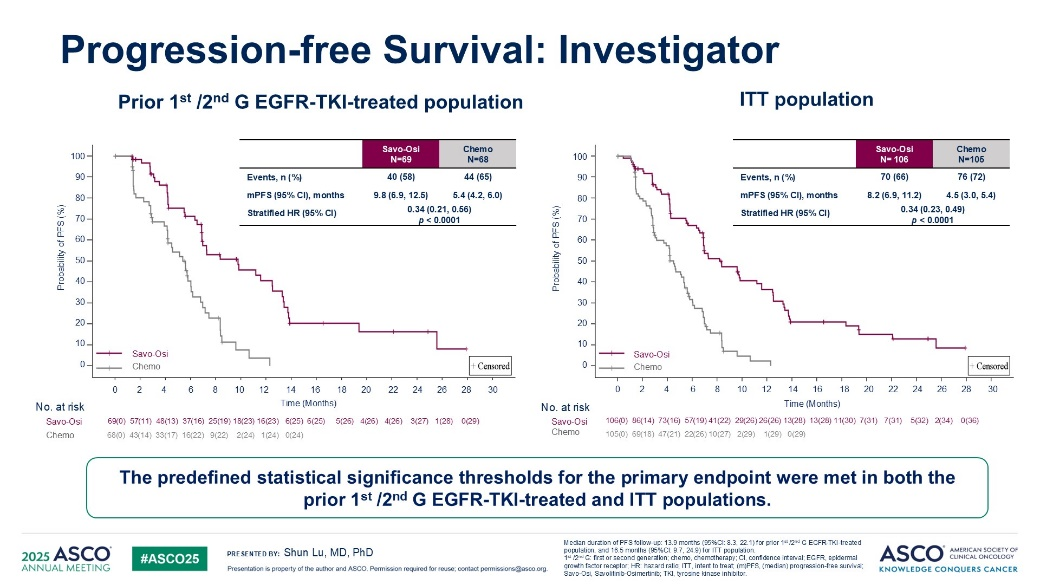 该研究与II期临床研究类似,纳入的人群既可以接受一代/二代EGFR-TKI类药物治疗或三代药物治疗进展,如患者接受一/二代药物治疗,拷贝数≥5或基于FISH检测,MET基因与7号染色体着丝粒比例≥2;若接受三代药物治疗,则MET拷贝数≥10,符合入组标准的患者接受赛沃替尼600 mg,每日一次(体重≥50kg)或400 mg,每日一次(体重<50kg)。对照组为含铂双药治疗,化疗组患者疾病进展后,允许接受双靶向药物治疗。主要研究终点为第一/二代药物耐药后的MET基因异常患者的PFS;若得到阳性结果,扩展到ITT患者的PFS分析。