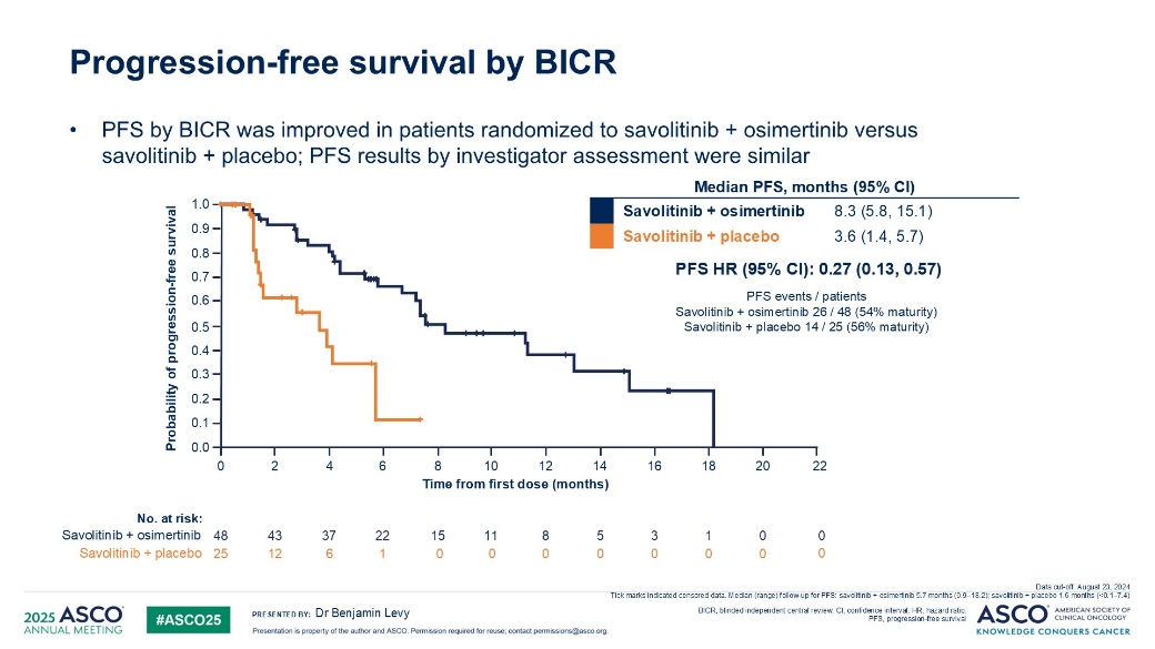 最终,双靶向治疗组和赛沃替尼组分别入组48例和25例患者,两组分别有35%和28%的患者基线有脑转移,19del患者占比分别为56%和80%,独立评审委员会评估的ORR分别为58%和16%,中位DoR分别为11.8个月和4.5个月;研究者评估的ORR分别为54%和24%,中位DoR分别为8.0个月和4.2个月。独立评审委员会评估的中位PFS分别为8.3个月和3.6个月,HR=0.27,颅内ORR分别为43%和25%,颅内中位DoR分别为未达到和6.9个月。
