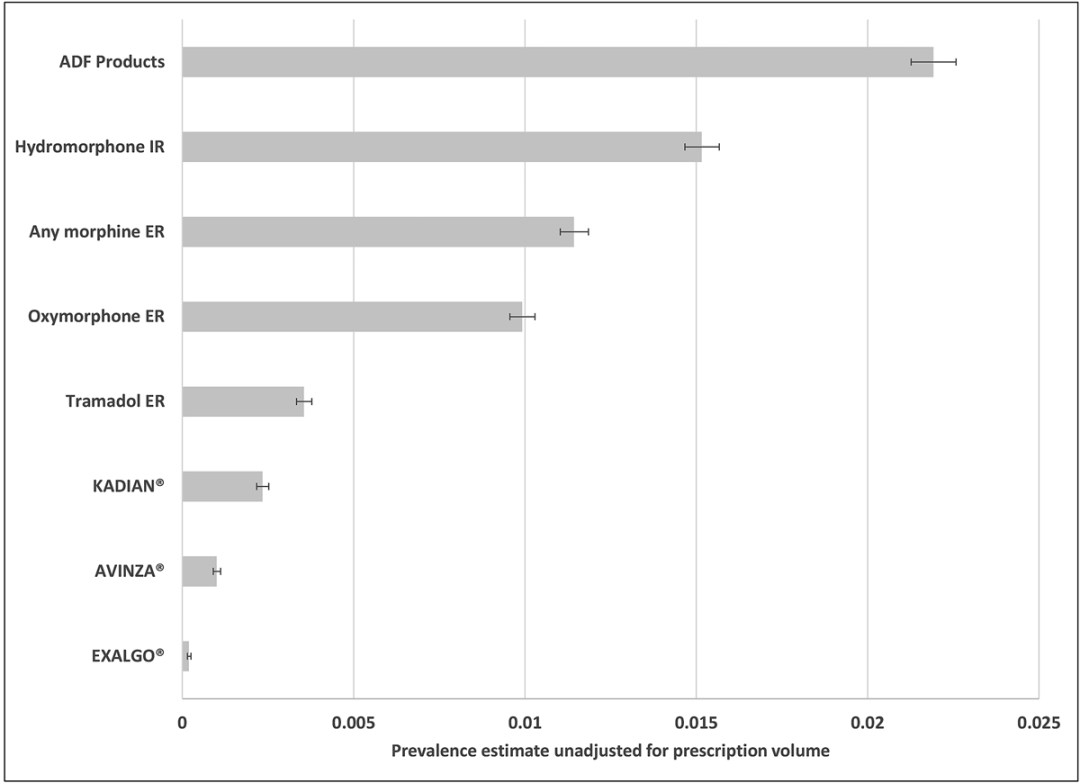 图4 OROS氢吗啡酮缓释片与其他阿片类药物在非口服途径(如咀嚼、直肠给药等)滥用比例的比较