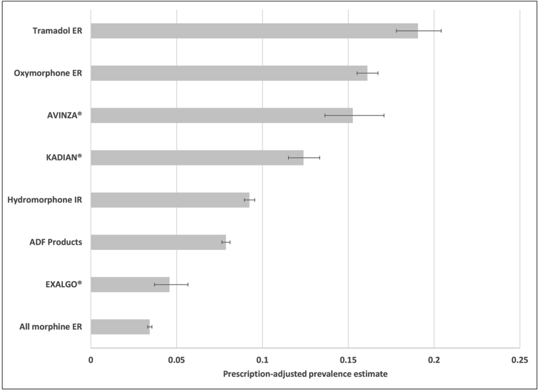图3展示了OROS氢吗啡酮缓释剂及其对照药物的处方量调整后滥用结果。除“所有吗啡缓释剂型”类别外,所有对照药物的处方量调整后滥用相对风险均显著高于OROS氢吗啡酮缓释片(p<0.0001)。