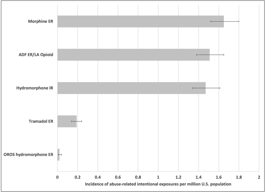 图5 OROS氢吗啡酮缓释片与其他阿片类药物在国家毒物数据系统(NPDS)中滥用相关暴露率比较