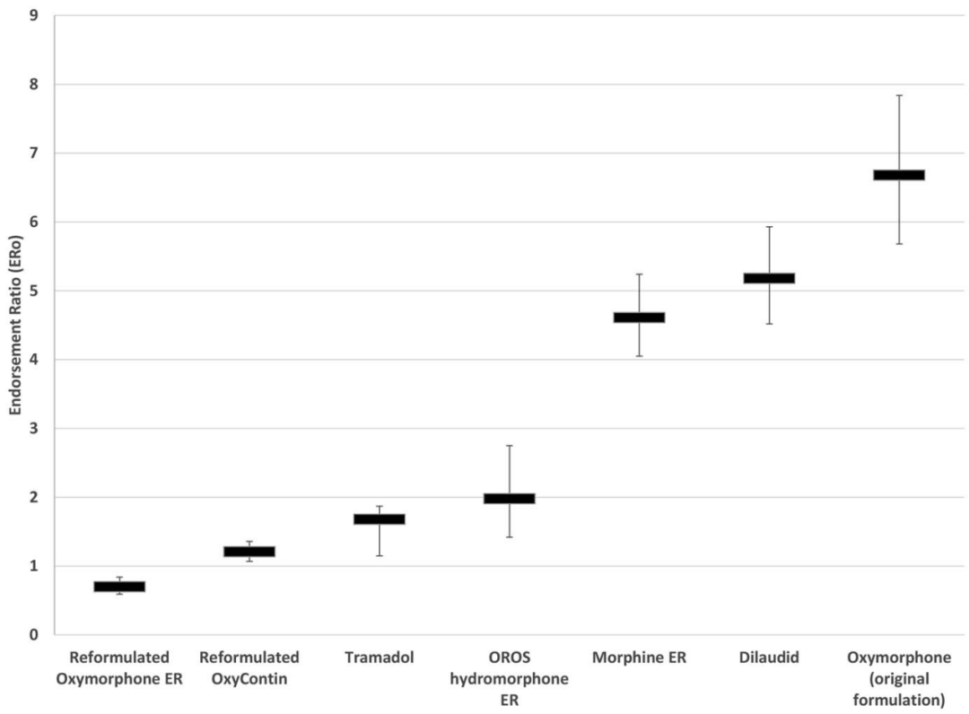 氢吗啡酮缓释片滥用支持-劝阻比(ERo=1.98)远低于普通氢吗啡酮(ERo=5.18)。(见图7)