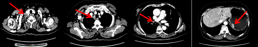 (3)关于纵隔淋巴结转移的来源,结合患者胃癌术后的病史,其区域淋巴结未见转移(0/9),故胃癌转移的可能性较小。尽管目前转移来源尚未明确(如乳腺癌、鳞癌或其他肿瘤),但依据影像学评估结果及临床分期标准,已可明确诊断为晚期恶性肿瘤。