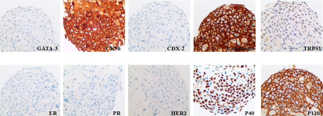 见癌细胞。IHC:CK5/6(+)、P40(+)、TRPS1弱(+)、GATA-3个别弱(+)、E-cadherin膜(+)、P120膜(+)、ER(-)、PR(-)、HER-2(-)、CDX2(-),结合细胞形态和对比既往病理,考虑为鳞状细胞癌或伴有鳞状分化的癌可能性大。