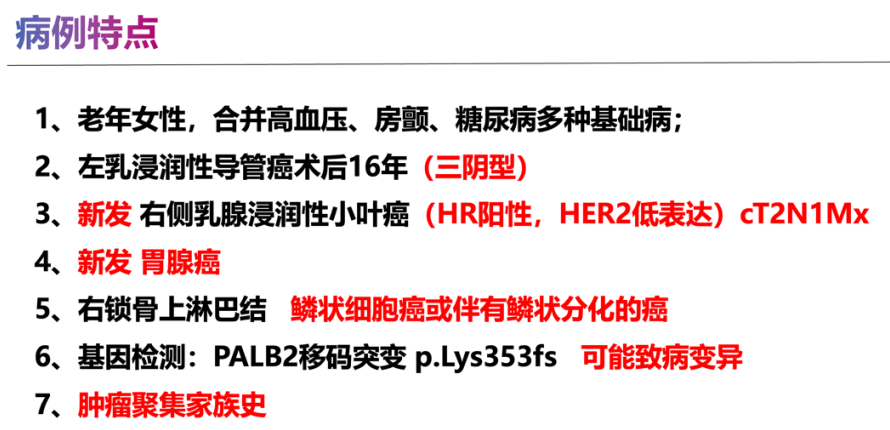 该患者为高龄女性,合并房颤、糖尿病、高血压等多种基础病,同时患有乳腺浸润性小叶癌、原发胃腺癌及左侧锁骨上鳞状细胞癌(或伴有鳞状分化的癌)等多种肿瘤。患者存在明确肿瘤家族史,并检出PALB2基因移码变异,病情较为复杂。对此,龚畅教授与曾银朵教授迅速发起第一次全院多学科会诊,组织乳腺外科、乳腺内科、肿瘤内科、病理科、胃肠外科、肿瘤遗传咨询、放射科、心血管内科等多学科专家开展联合诊疗会诊。