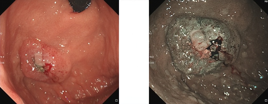 胃底近后壁见3*3.5cm大小隆起,宽基底,表面凹凸不平,见糜烂溃疡,质脆,表面结节状充血水肿,有自发性及接触性出血。肠镜检查未见器质性病变。