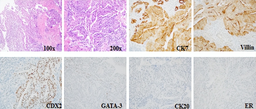 腺癌,考虑胃原发可能性大。IHC:CK7(+)、Villin(+)、CDX2部分(+)、CK20(-)、GATA-3(-)、ER(-)、HP(-)、P53强弱不等(+)、Ki67约80%(+)。