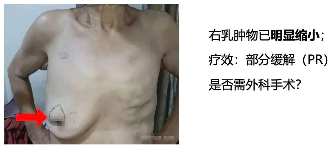 乳腺外科:右乳肿物明显缩小,建议行右乳肿物切除术,可考虑同期行锁骨上淋巴结清扫术,以达到更好的局部治疗效果。