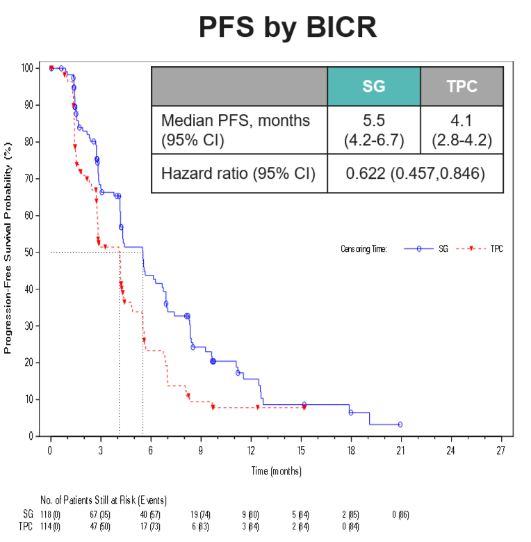 ESMO靶向抗癌治疗亚洲大会(ESMO TAT ASIA)进一步更新了EVER-132-002研究中国人群数据。该研究中国患者占比7成,结果显示mPFS为5.5个月vs 4.1个月,HR 0.622(95%CI:0.457-0.846),mOS分别为为20.5个月vs 15.1个月,HR 0.583(95%CI:0.401-0.847)[10]。该数据再次夯实了SG在中国患者中治疗的循证依据,验证了显著的PFS获益和具有临床价值的OS获益。