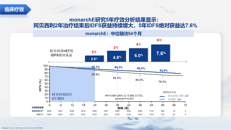 值得关注的是,阿贝西利在多个亚组中均显示出与整体人群一致的治疗获益。今年公布的年轻患者亚组数据[8]显示,其5年IDFS获益高达10.3%;在中国人群中也有持续披露的数据,5年IDFS获益为6.8%[9]。此外,monarchE研究中有32%的患者接受了新辅助化疗,在这一亚组中,4年IDFS获益为9.1%,复发风险降低了约40%。这些稳定、持续且一致的临床获益,极大增强了我们对该药物的信心。