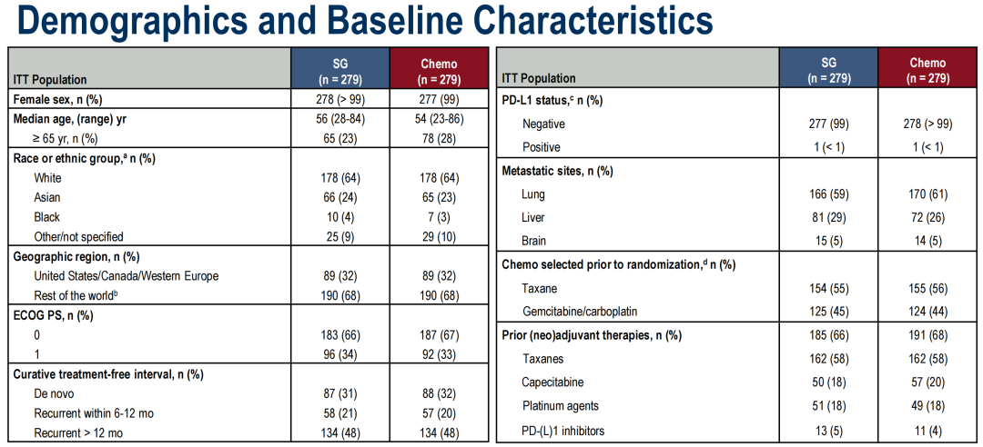 在安全性方面,SG组的中位暴露时间长于化疗组(SG、紫杉类、GC:8.3 vs 6.3 vs 5.8个月),≥3级的治疗期间不良事件(TEAEs)与化疗组相当(66%vs 62%),但停药率仅为化疗组的三分之一(4%vs 12%),导致减量的不良事件发生率也低于化疗组(37%vs 45%)。SG组的常见≥3级不良事件以中性粒细胞减少(43%vs 41%)和腹泻(9%vs 1%)为主。这些安全性数据表明SG作为一线治疗方案良好的治疗耐受性,常见不良事件仍为临床易于管理的骨髓抑制和胃肠道反应。